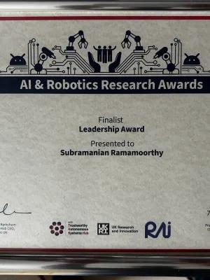 AI & Robotics Research Awards 2025 Hosted by the Trustworthy Autonomous Systems (TAS) Hub Congratulations to Ram Ramamoorthy who, in acknowledgement of his role in leading a team of outstanding researchers dedicated to advancing the fields of AI and Robotics, was nominated for the 2025 AI & Robotics Research Leadership Award. UKRI Tas Hub Post This article was published on 2025-04-03